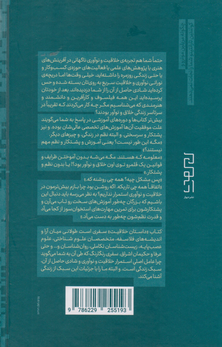 کتاب «داستان خلاقیت» همانطور که در زیر عنوانش آورده شده راهنمای سبک زندگی برای رسیدن به تداوم در خلاقیت و شادی است. حتما برای شما هم پیش آمده که در کلاس یا جمعی حضور داشتهاید و کاری از شما خواسته شده اما همهی آدمها نمیتوانند در این موقعیت به طور مشابه عمل کنند. در واقع همهی شما در مکان و شرایط یکسانی حضور دارید اما نمیتوانید خلاقیتتان را به یک میزان بروز دهید. اکثر کسانی که در کلاسهای مربوط به هنر و یا نویسندگی شرکت کردهاند، میتوانند این موضوع را تایید کنند. اندک زمانی به شما داده میشود تا از تمام ظرفیتهای ذهنی و خلاقیت خود کمک بگیرید و اثری را خلق کنید اما در نهایت همهی هنرجویانی که در کلاس حضور دارند، نمیتوانند این مرحله را با موفقیت پشت سر بگذارند. حال در ذهن خود با این سوال مواجه میشویم که ایراد کار از کجاست؟ چرا دیگران میتوانند موفقیت را برای خود رقم بزنند اما من نمیتوانم؟ چه موانعی بر سر راه خلاقیت من وجود دارد که باعث این اتفاق شدهاست؟ نویسنده در این کتاب سعی کرده تا پاسخ همهی این سوالات را در اختیار شما قرار دهد. در دنیایی زندگی میکنیم که خلاقیت در هر زمینهای حرف اول را میزند، از همین رو خواندن این کتاب میتواند برای هر کسی مفید و کاربردی باشد. خلاقیت مسئلهای است که میتواند شما را از دیگران متمایز کند، بنابراین باید اطلاعات کافی را در این زمینه داشته باشید تا همچون نقشهی راه از آن استفاده کنید.
